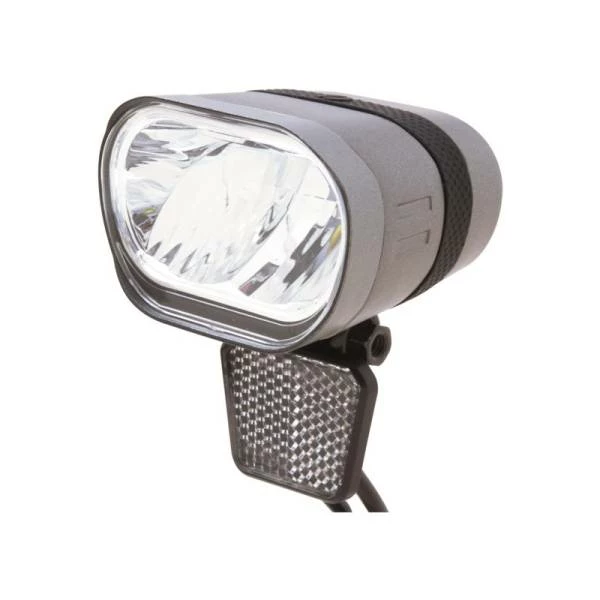 De koplamp is uitgerust met een robuuste, RVS voorvorkbeugel en een efficiënte voorreflector voor optimale veiligheid en zichtbaarheid.